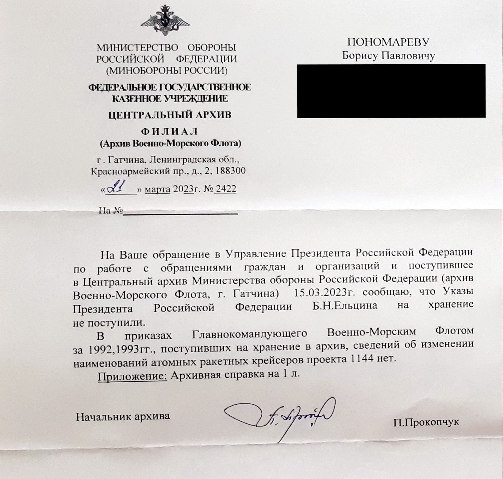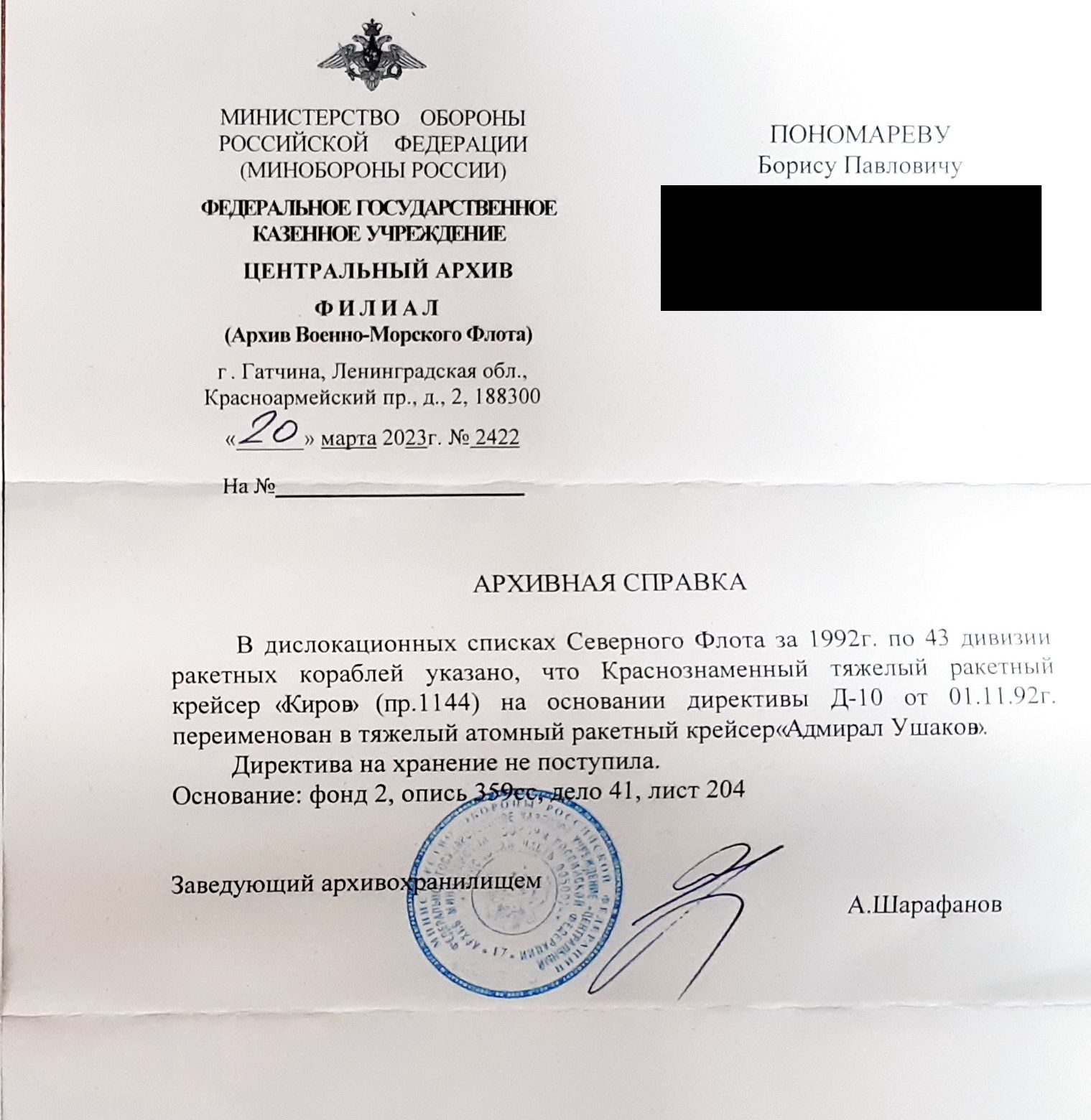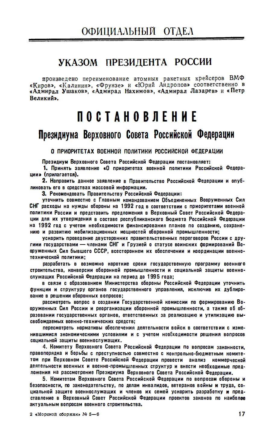 Наступило время перемен…А КАК нас переименовывали - можно увидеть в майском номере “Морского сборника” за 1992г. Ни номера Указа, ни объяснений… НИЧЕГО! Поставили перед фактом. Не знаю, КТО именно предложил эту идею. По слухам, даже ГК ВМФ (29.11.85 - август 1992гг) адмирал флота В.Н.Чернавин узнал об этом случайно… Ремарка Поиски самого Указа ПРФ не принесли положительного результата. Я обращался во многие инстанции, даже в «Ельцин-Центр», но увы…В итоге в Центральном архиве ВМФ мне порекомендовали искать Указ в Центральный архив МО РФ, но я этого делать не стал. Может, у кого другого есть желание? Самый «верхний» документ, что я нашел, это приказ МО в виде выписки из личного дела нашего офицера. При изменении должности офицера есть пометка: «В соответствии с Приказом МО РФ №-05 от 27 мая 1992г об изменении наименования таркр «Киров» на таркр «Адмирал Ушаков» полагать на должности…». Любопытно внимательно поглядеть на справки из ЦА ВМФ,что я любезно получил из ЦА ВМФ, и сравнить даты. Приказ МО от 27 мая 1992г. Однако в справке от 20.03.23г сказано, что фактически переименование на КСФ произошло 01.11.92г на основании Директивы МО РФ Д-10. Обращаю внимание, что это несекретный документ, но приказов ГК ВМФ о переименовании в Архиве нет. Лихие 90-е….Что поделаешь, разруха в головах. А Вы помните, Владимир Николаевич, какие слова Вы произносили 12 апреля 1981г, на кого советовали равняться, какого крейсера традиции призывали нас поддерживать?... |